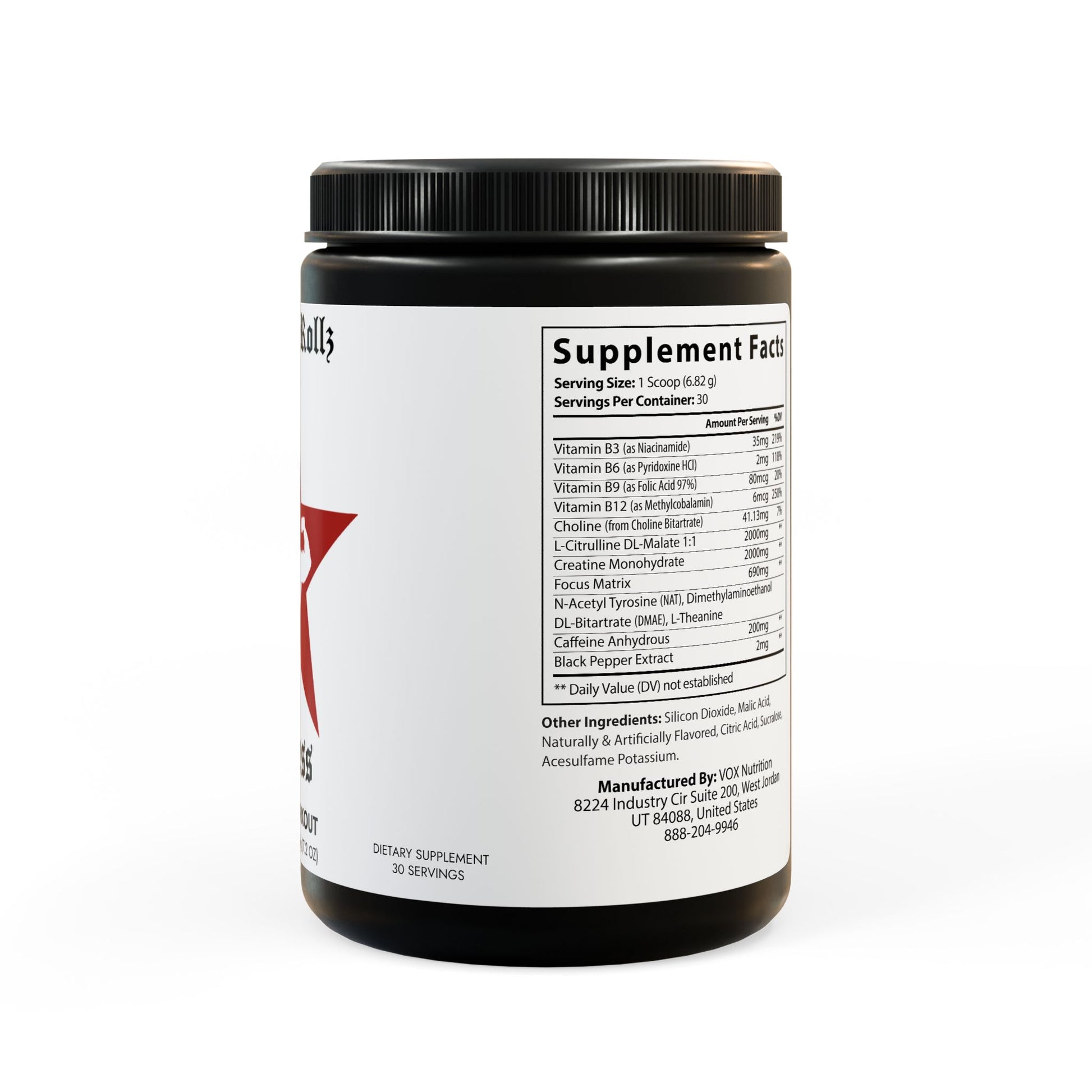 Ingredients: Vitamin B3 (as Niacinamide), Vitamin B6 (as Pyridoxine HCl), Vitamin B9 (as Folic Acid 97%), Vitamin B12 (as Methylcobalamin), Choline (from Choline Bitartrate), L-Citrulline DL-Malate 1:1, Creatine Monohydrate, N-Acetyl Tyrosine (NAT), Dimethylaminoethanol, DL-Bitartrate (DMAE), L-Theanine, Caeine Anhydrous, Black Pepper Extract. Other Ingredients: Silicon Dioxide, Malic Acid, Naturally & Articially Flavored, Citric Acid, Sucralose, Acesulfame Potassium.